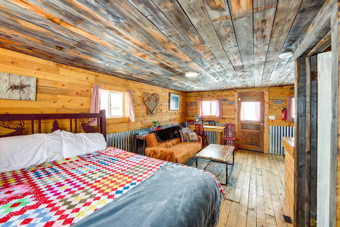 Step inside to find a light-filled studio layout with simple comforts and vintage charm. There’s a queen bed tucked into the main space, a twin foldout couch, a full kitchen for easy meals, and a bathroom with a shower. A private porch looks out over open hills and changing skies... perfect for slow mornings or sunset unwinding. Inside or out, the Trapper is a quiet place to recharge between adventures. What You’ll Love: 🛏️ Sleeps 2 plus one: 1 queen bed and 1 twin foldout couch 🍳 Full kitchen: Everything you need for easy meals 🛁 Private bathroom with a shower 📶 Wi-Fi: Great for staying connected (cell service is spotty) 🌄 Big mountain views from the porch ♨️ Hot tub access: Relax at the shared Hitchin’ Post clubhouse ✔️ Plenty of room to park your trailer! Bring the toys, boat, sleds, or even horses. Whether you're sipping coffee on the porch or unwinding after a day on the trails, this little cabin offers simple comforts and space to slow down.
